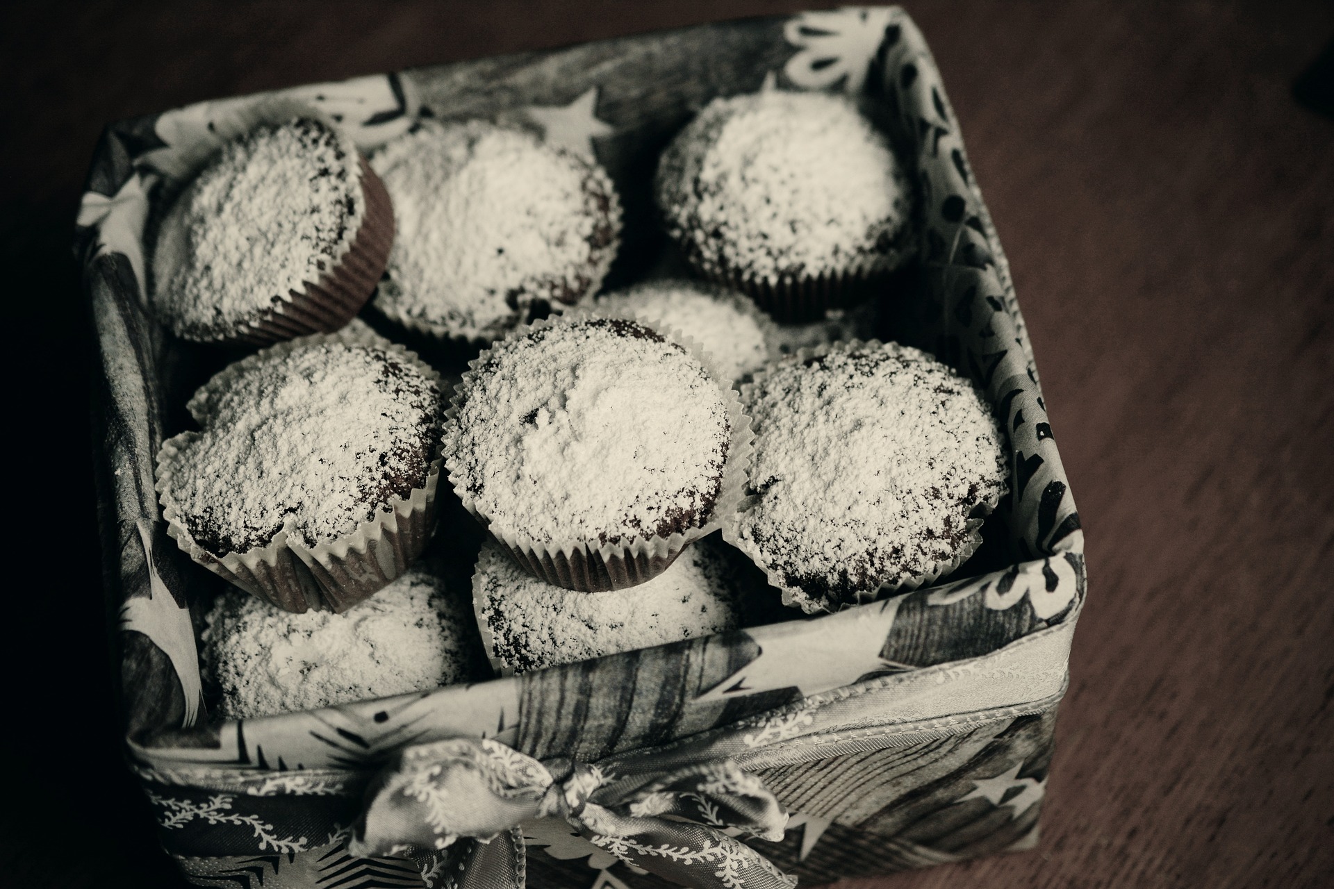 מארז אישי מאפינס שוקולד וקינמון עם פירות יער, שוקולד לבן/חום, פירות הדר, קרם חלב, נוגט, קוקוס ועוד באריזה מהודרת.