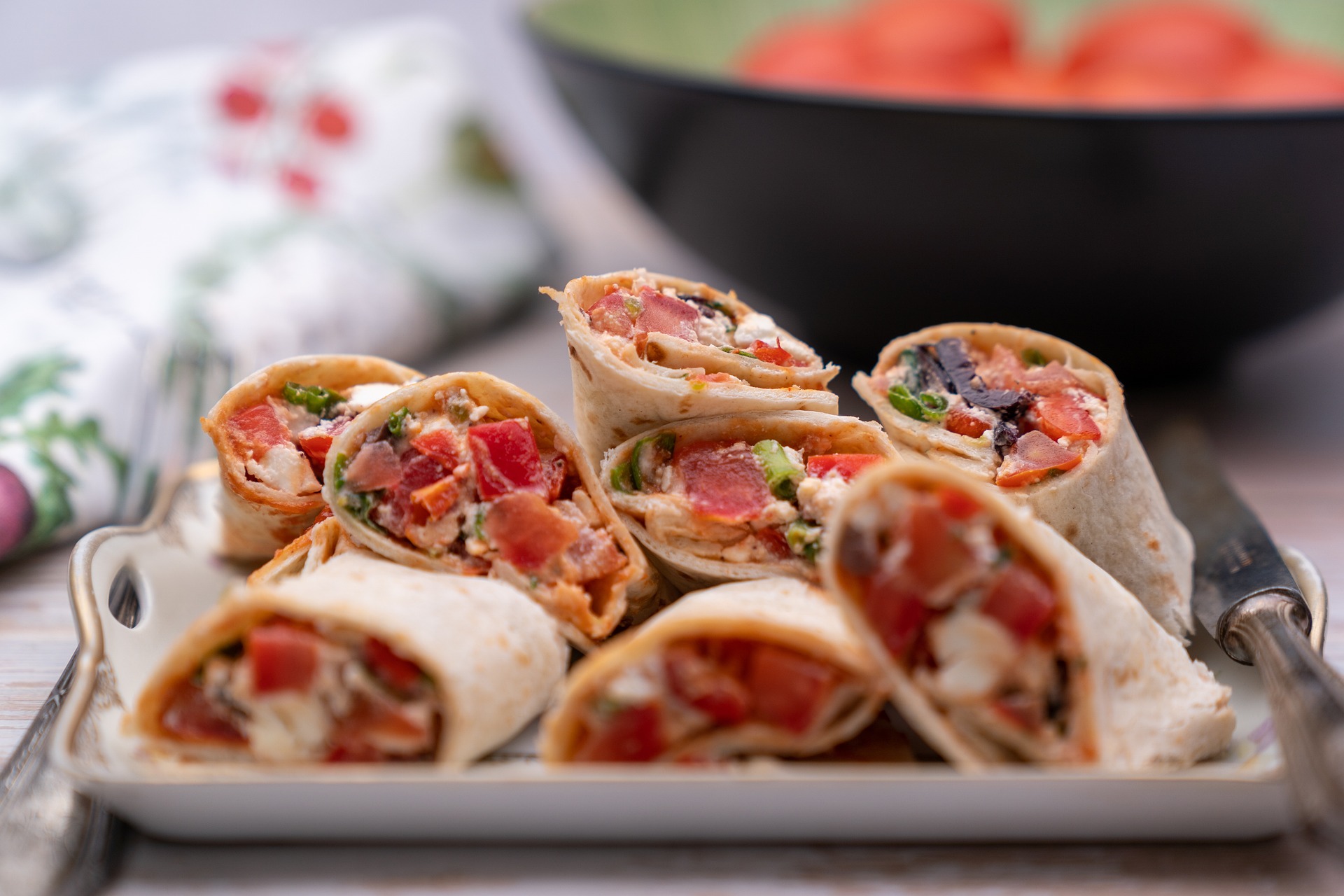 מגש טורטיות עם סלמון, עשבי תיבול, ממרח זיתים, ממרח שום, ממרח פסטו, עגבניות שרי, מלפפון, חסה, בצל ירוק וסגול, פלפל אדום/ירוק, שומר, שמיר, צנוניות, פטרוזיליה, כוסברה.
